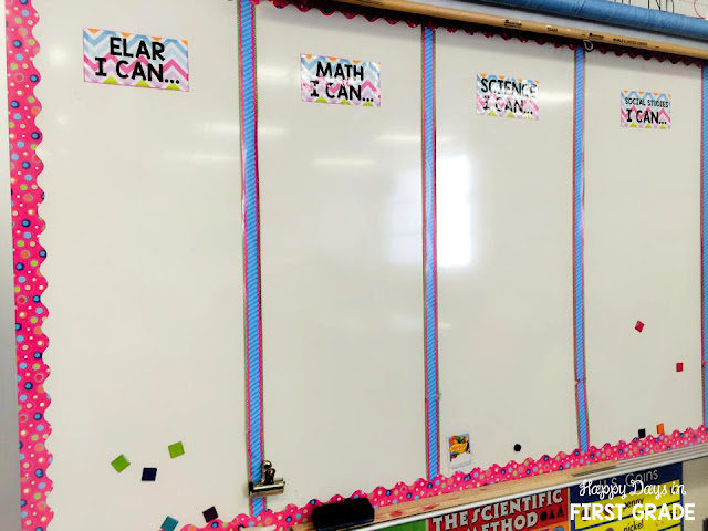 My Whiteboard BEFORE: I had dye-cut the individual letters for the different core subjects and “I Can” statements. They saved me a good amount of time since I didn’t have to rewrite them every week. However, they kept falling off and were easily damaged.