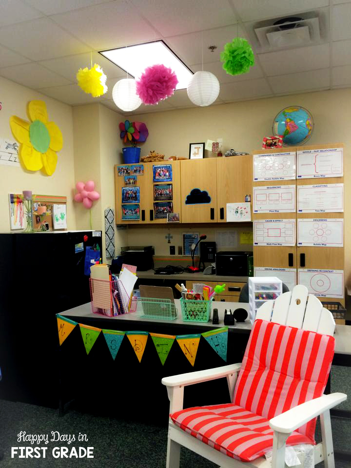 My Teacher Desk AFTER: I removed the crates and the wrapping paper that was used to decorate the front of my desk. This simple change leaves the front of my desk more open and even left room for me to hang my handy-dandy bunting. My sweet husband helped me hang the lanterns and pom-poms on top of my desk to give the ceiling a little more spunk and color. I’ve also reorganized my desk, and can I just say how much I love my new supplies drawer organizer?! 🙂