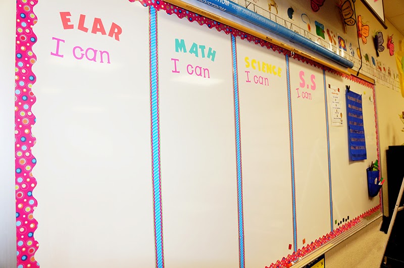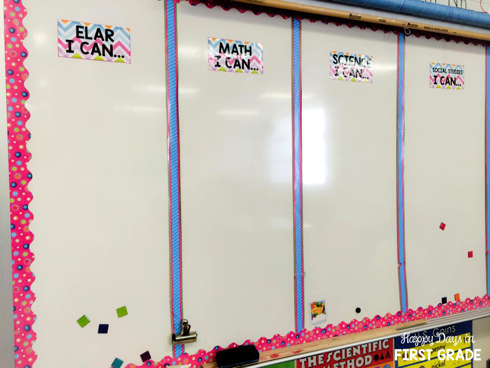 My Whiteboard BEFORE: I had dye-cut the individual letters for the different core subjects and “I Can” statements. They saved me a good amount of time since I didn’t have to rewrite them every week. However, they kept falling off and were easily damaged.