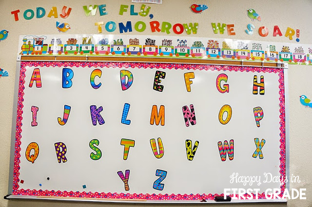 My Whiteboard AFTER:  This year, I have printed and laminated these labels to stay all year. Since they are not individual letters but on single labels, I know it will be much easier for them to stay in-tact.