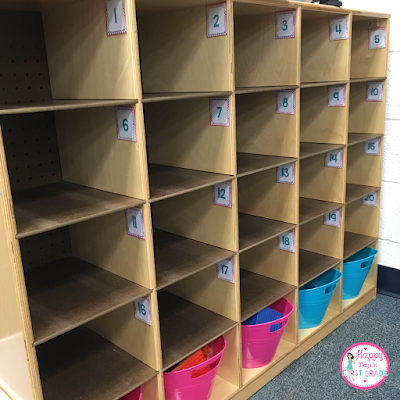 And here are some ways I am organizing manipulatives and students work this year! Each child is assigned to a number according to the roster which he or she will keep all year.  After writing their name on each assignment, students will also be asked to write their number.  When I am done checking their work, I can simply place it in their cubby to take home afterwards.