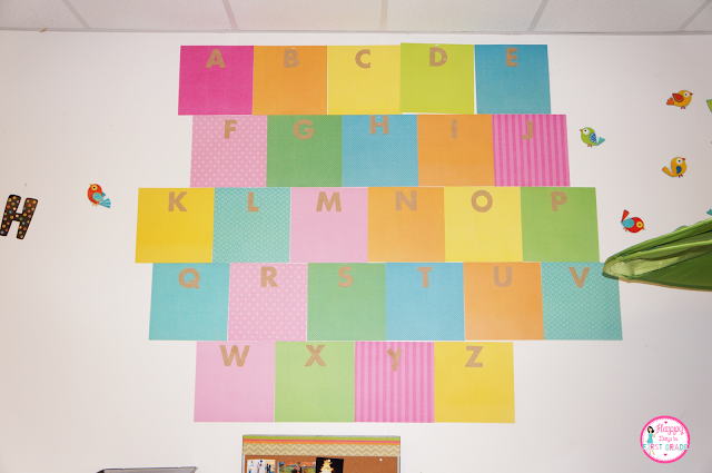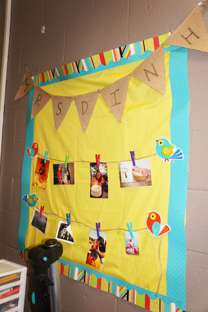 Right behind my reading table is a HUGE white wall that was calling out to be decorated.  I brainstormed all summer what to do with it, until I found my Pinspiration (inspiration from Pinterest)!  Using scrapbooking paper and self-adhesive burlap letters, I created a vocabulary word wall for my students.  Each time we learn new content words, I will ask my students to write them on big sticky notes that we will be stick them onto our wall!  I’m so excited to see how our wall will be filled up by the end of the year!