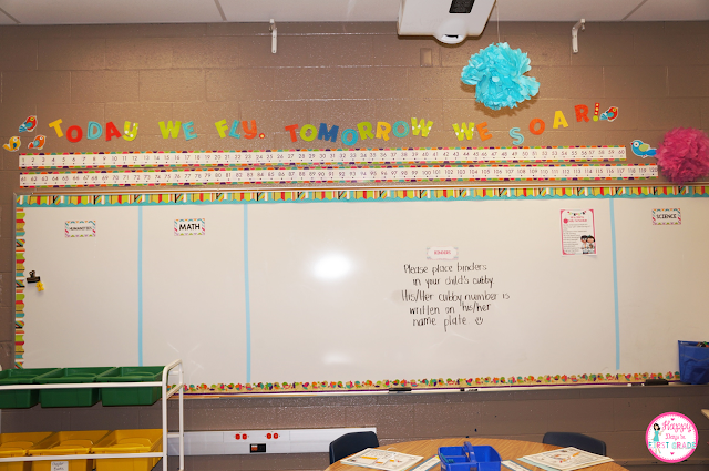 My goal for classroom decoration has always been engaging and welcoming without being distracting. With that in mind, I spruced up our big white board with some fun border and sectioned it out for our weekly student-generated anchor charts.  One of my sweet teammates was kind enough to let me borrow her light blue masking tape when I ran out of border.  Who knew masking tape came in different colors?!!! And of course, I had to bring out my Boho Chic Birdies from my previous classroom along with an inspirational quote for my sweet students!  Please don’t excuse the note on the board, it was meant for Meet-the-Teacher Night. 🙂