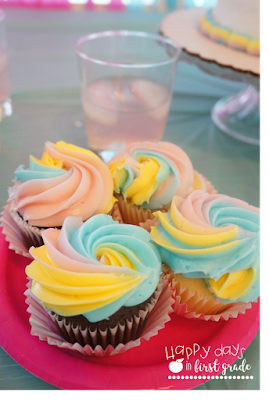 For her cake table, I decorated the background with matching yellow, pink, and aqua streamers in alternating heights. The easiest way to hang streamers that I have found, is to tape them beforehand on a long piece of clear tape. Once it’s complete, hang the entire strand to its designated spot. It’s SUPER easy to put up and SUPER easy to take down! I also added a white and gold glitter banner to the background as an accent. I also added to the cake table some unicorn paper straws, party hats, unicorn chocolate bark, cupcakes, small marshmallows drizzled in unicorn chocolate, balloons, and a simple cake. The banner in the front of the table fit perfectly with our theme and made her day even more special!