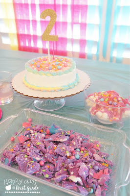 For her cake table, I decorated the background with matching yellow, pink, and aqua streamers in alternating heights. The easiest way to hang streamers that I have found, is to tape them beforehand on a long piece of clear tape. Once it’s complete, hang the entire strand to its designated spot. It’s SUPER easy to put up and SUPER easy to take down! I also added a white and gold glitter banner to the background as an accent. I also added to the cake table some unicorn paper straws, party hats, unicorn chocolate bark, cupcakes, small marshmallows drizzled in unicorn chocolate, balloons, and a simple cake. The banner in the front of the table fit perfectly with our theme and made her day even more special!