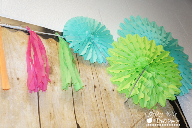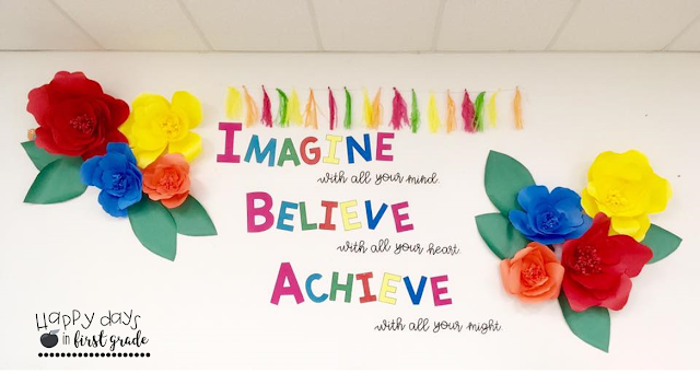 Classroom Motto: Since our classroom is an interior room with no walls, I struggled to find a display that would fill up this HUGE space and is meaningful to our class. I thought of making separate focus boards for each individual subject. However, the drawers and floor cabinets underneath of this big board, makes it troublesome for me to hang any anchor charts or posters. Therefore, this inspirational quote along with these easy-to-make flowers are perfect to brighten up our classroom!