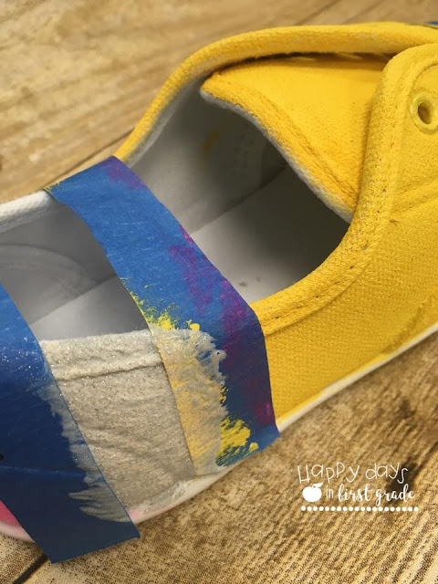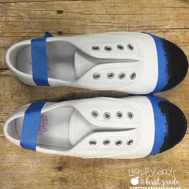 Step 2: Remove the shoelaces and section off the different parts of the shoes using Painter’s Tape.  Then paint the tip of the shoes black for the lead of the pencils.