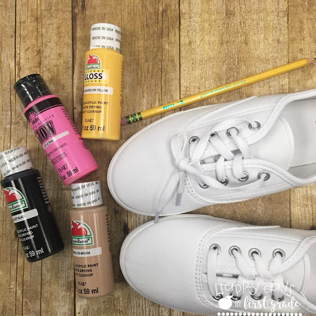 Step 1: Use a clean pair of white canvas (fabric) shoes, acrylic paints (pink, yellow, metallic, black, and beige), a couple small paint brushes, and a roll of Painter’s Tape.