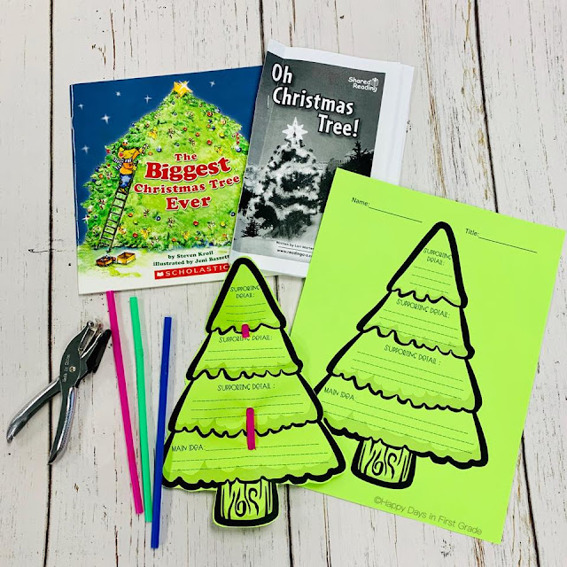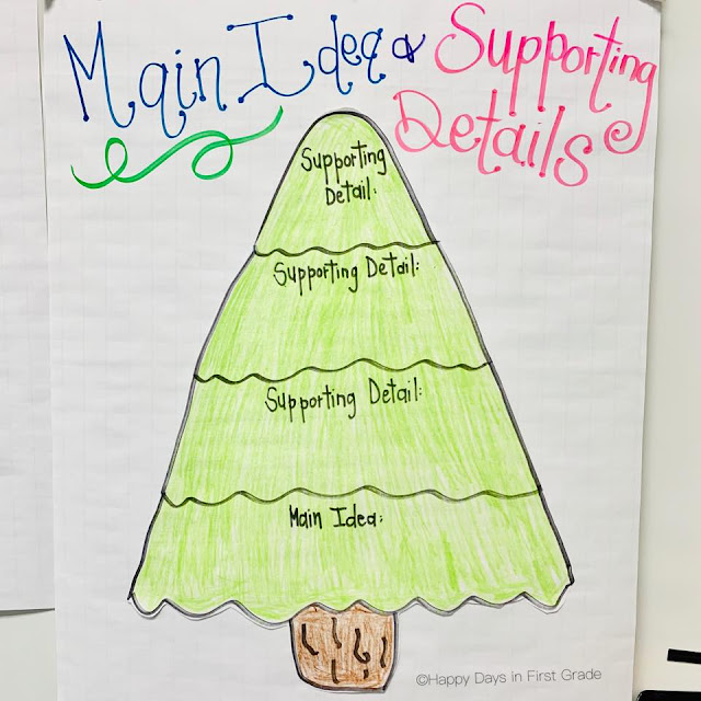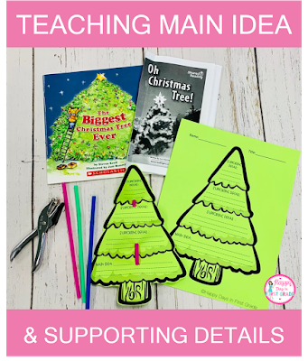 The next day, we read The Biggest Christmas Tree Ever by Steven Kroll and then identified the main idea and three supporting details as a class. Since fictional texts are more challenging for little learners to identify the main idea, I asked my students to close their eyes and think deeply about what the entire story was all about. After recording their response, they shared three supporting details aloud and wrote them on their copy of the graphic organizer.