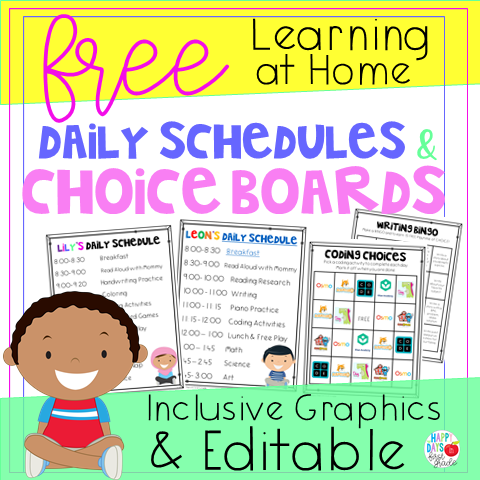 Since consistency and routines are so important to help children feel safe and successful, creating an age-appropriate schedule is essential for your child to learn at home. Children 5 and younger need short increments of time for each activity, while older children have built up stamina and can focus on certain subjects for longer periods of time. Here are the schedules that I made for my two kids who are a second grader and pre-kinder.