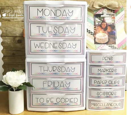 I always make copies a week ahead and then immediately store them in these Sterilite Drawers with the days of the week labeled on them.  No need to go through piles and piles of papers to find the ones that I need.  I also use the Mini Drawers to store all of my supplies.  I love that everything that I need is right at my Teacher Area, and the labels have saved me so much time to focus on the kids and instruction.