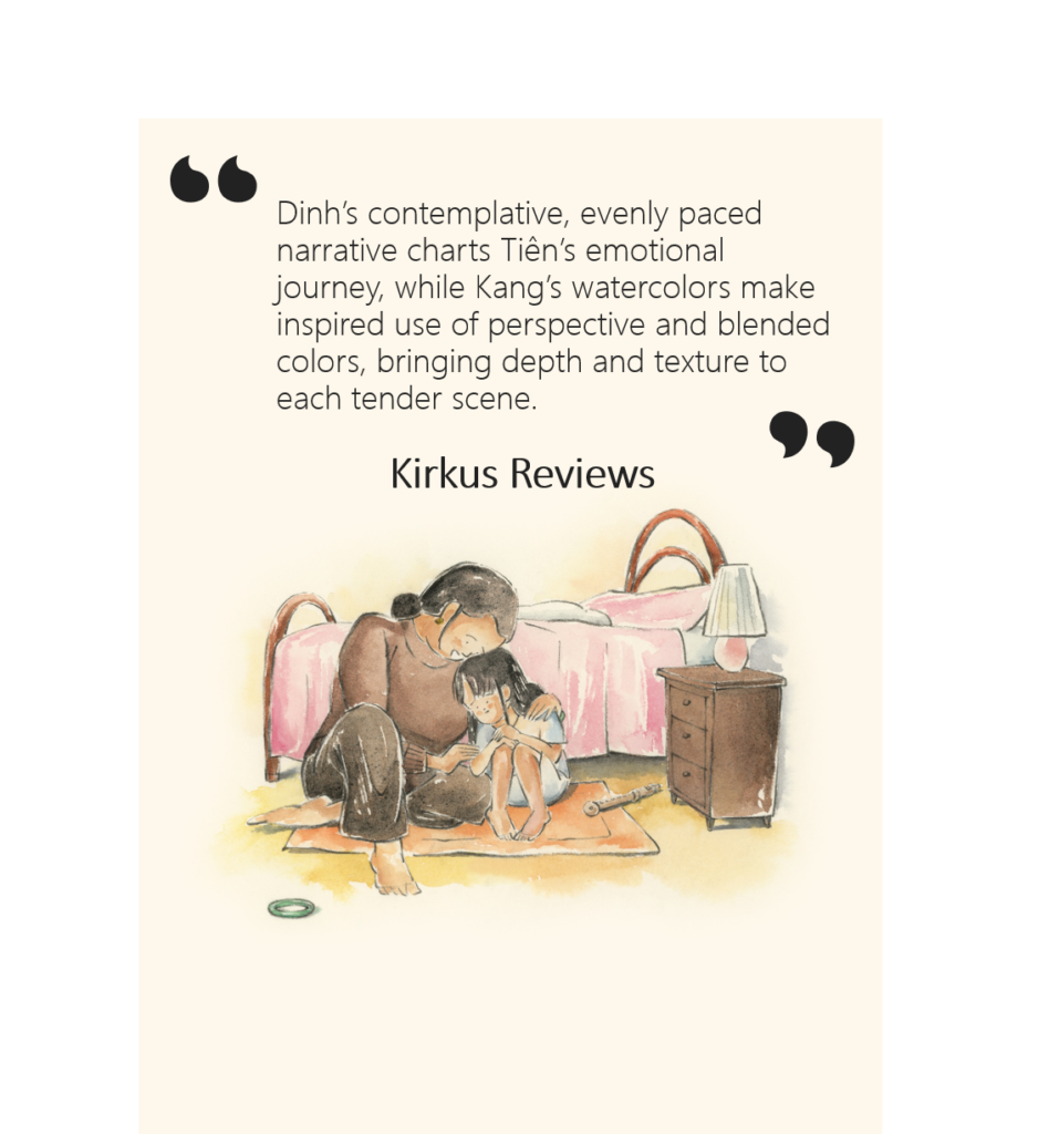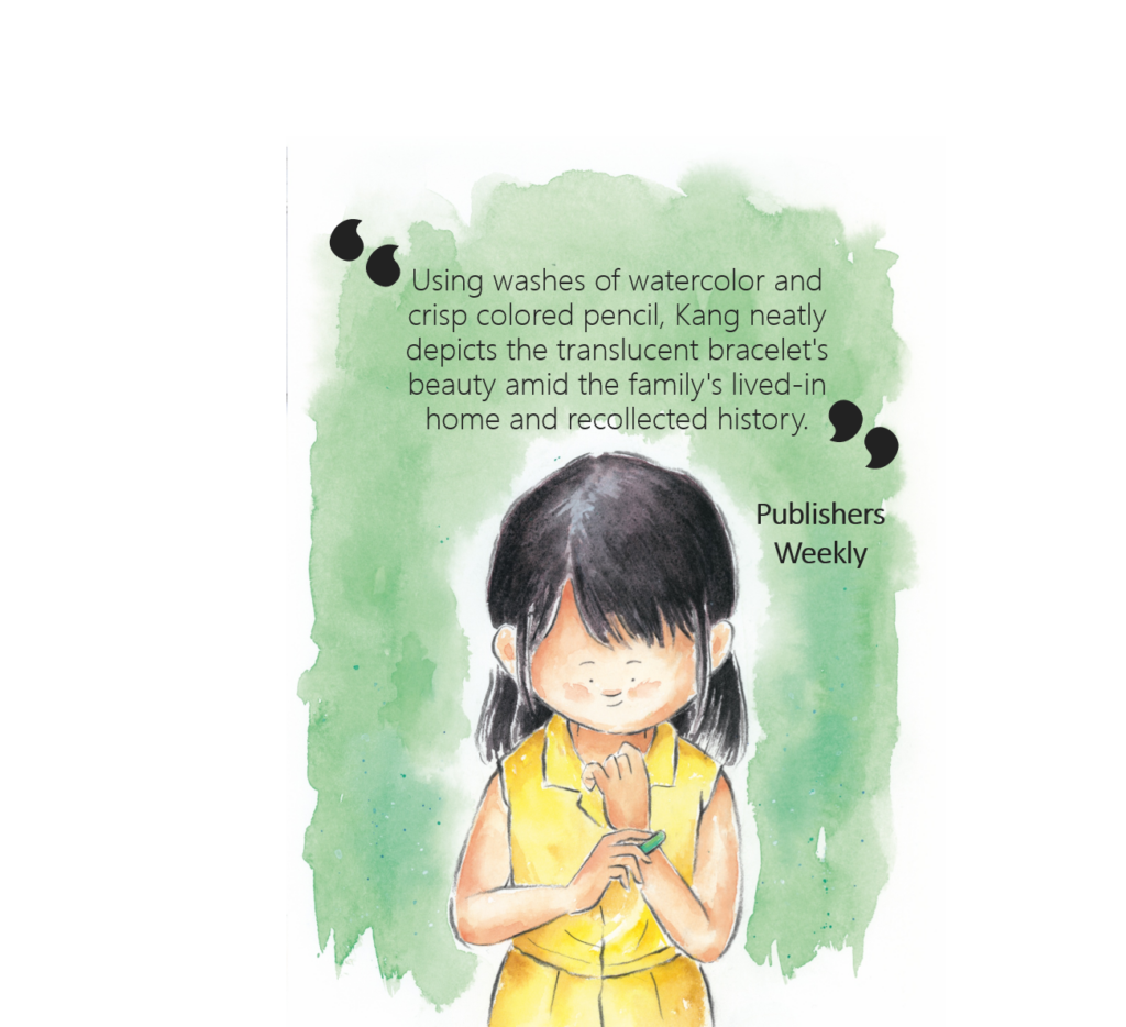 Although Tien loves the Vietnamese traditions her family celebrates, more than anything she wants to fit in at school and be just like her classmates. So, when all the girls start wearing brand-new sparkly bracelets, Tien tries to hide the simple jade bangle her mother gave her in memory of her grandmother. Now her bracelet looks like an old green thing and an embarrassed Tien runs home crying, flinging it on the floor. Her sympathetic mama understands and takes Tien to the shop to buy the popular bracelet. But at the last minute, Tien remembers her grandmother’s love and decides to wear her jade bracelet proudly.